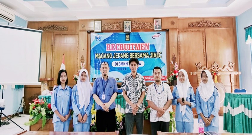 Rabu, 8 November 2023 SMK N 1 Blora mengadakan rekruitmen karyawan dari PT JIAEC. PT Japan Indonesian Association Economic Center ( JIAEC) merupakan perusahaan yang bergerak dibidang Sumber Daya Manusia sebagai penyelenggaraan program pemagang ke Jepang. PT JIAEC sudah berdiri sejak tahun 1972 berdasarkan ijin Departemen Luar Negeri Jepang No.13. PT JIAEC yang sudah bekerja sama dengan SMK N 1 Blora beralamat di Jalan Darmo Green Garden No. D-8, Suko manunggal, Surabaya, Jawa Timur 60188 .
